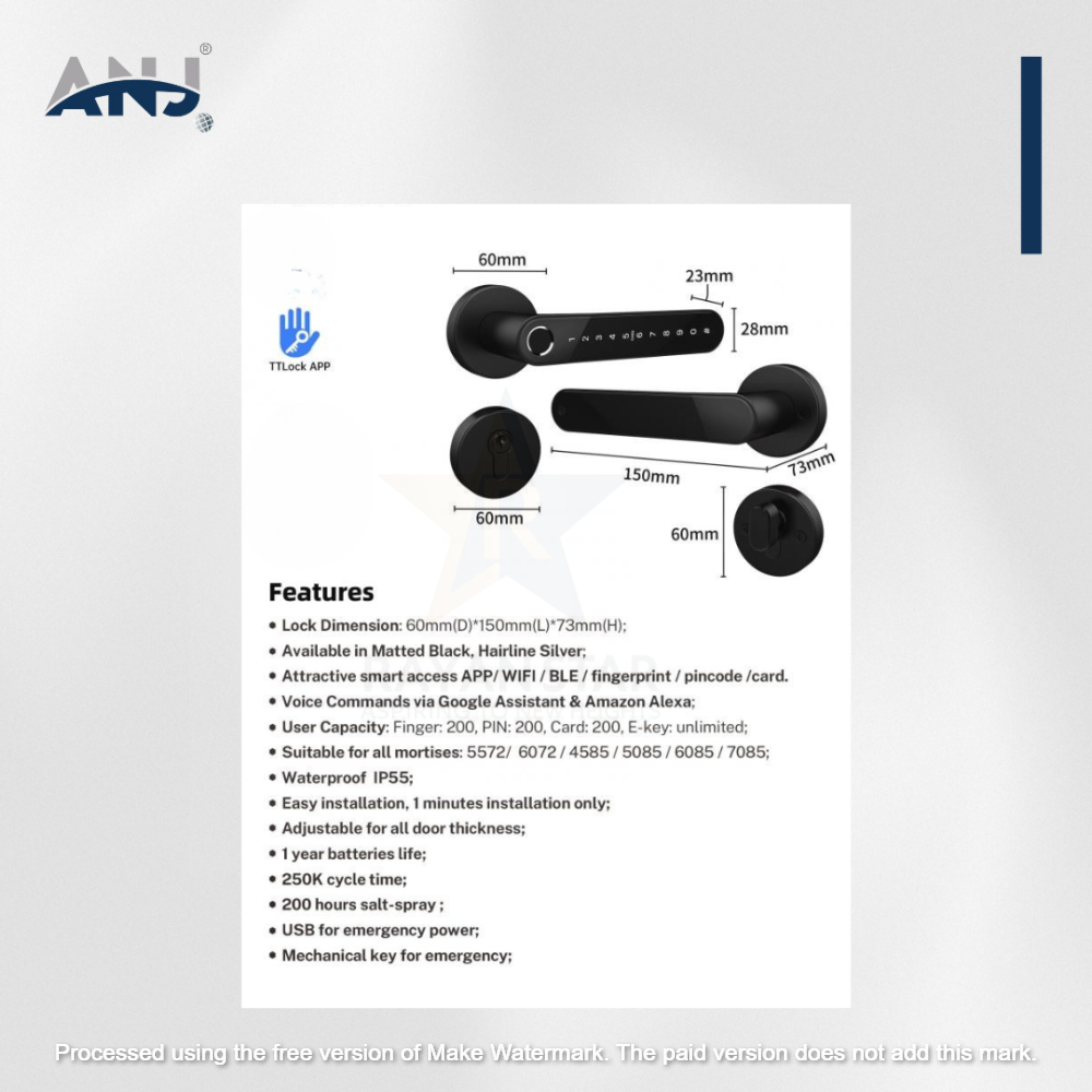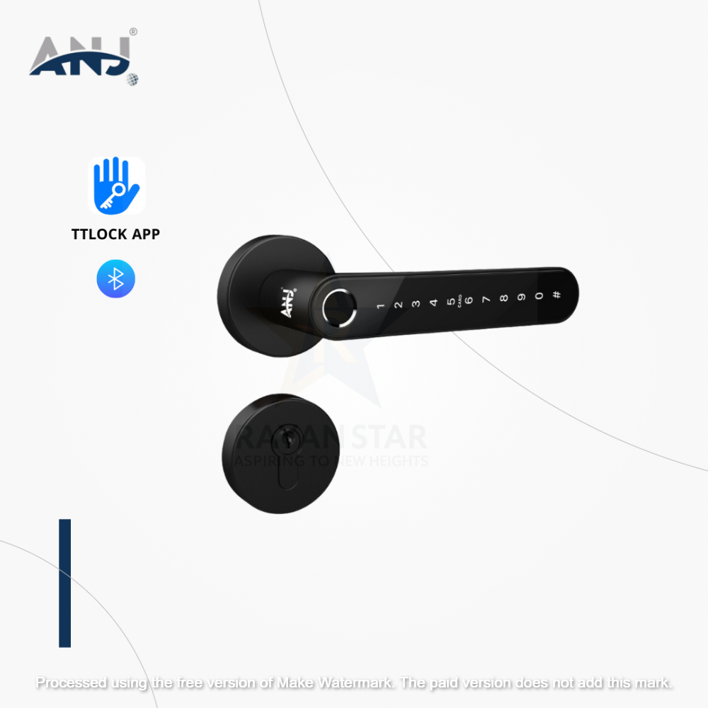 قفل باب ذكي داخلي من ANJ بتقنية TTLock، يتيح لك الدخول بالبصمة، الكود، البلوتوث، أو المفتاح. مثالي للمنازل والمكاتب.
